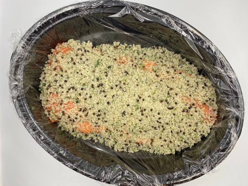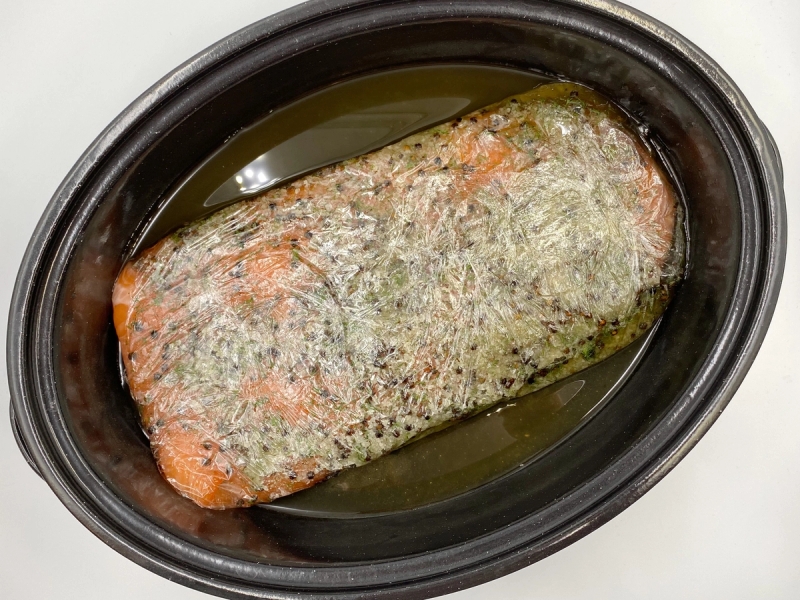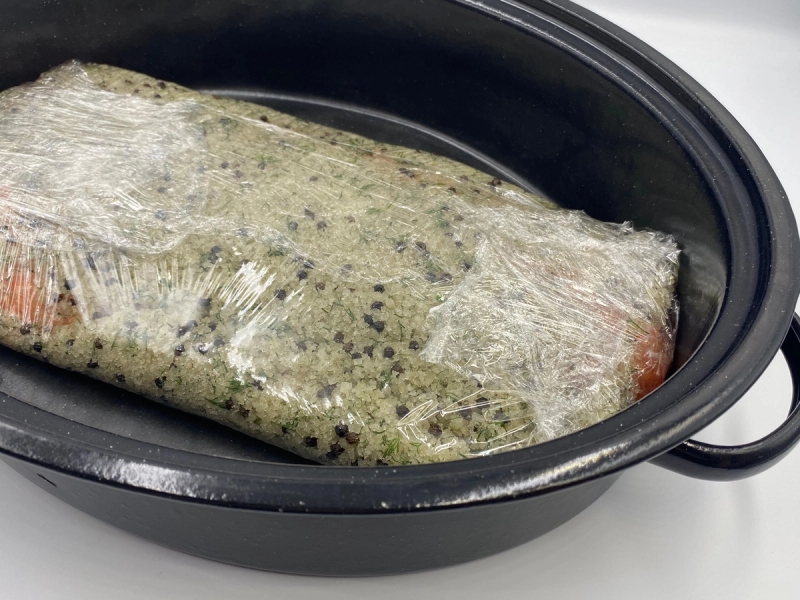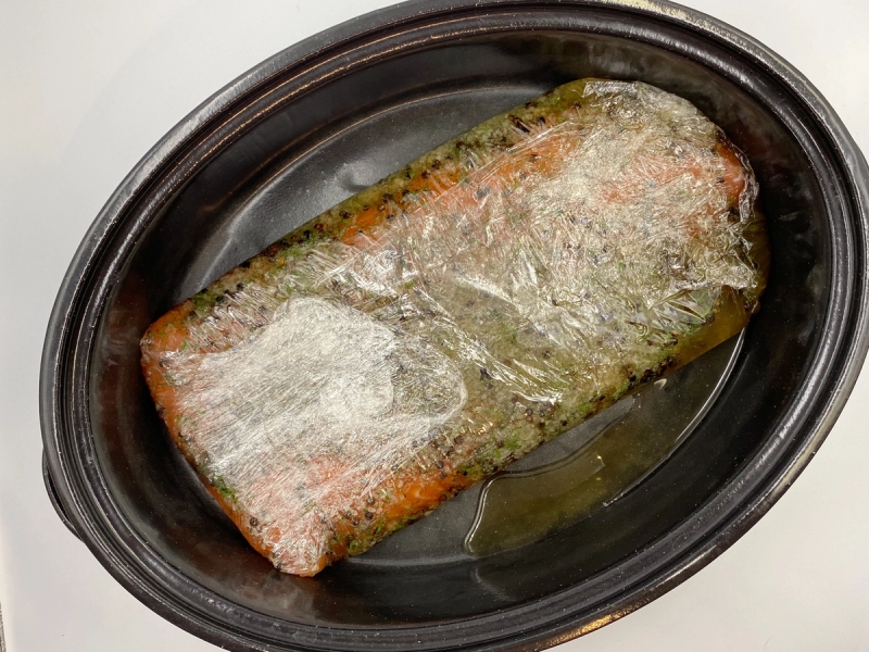 - Bien refermer la pellicule plastique sur le saumon. 📷
