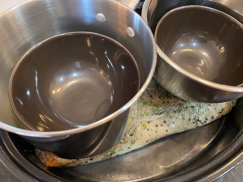 - Déposer quelque chose de lourd sur la pièce de saumon (j'utilise souvent des casseroles à fonds épais et des bols) et mettre au frigo pour au moins 12 heures. 📷