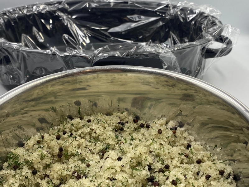 - Mélanger le sel, le sucre, le poivre et l'aneth dans un bol. 📷